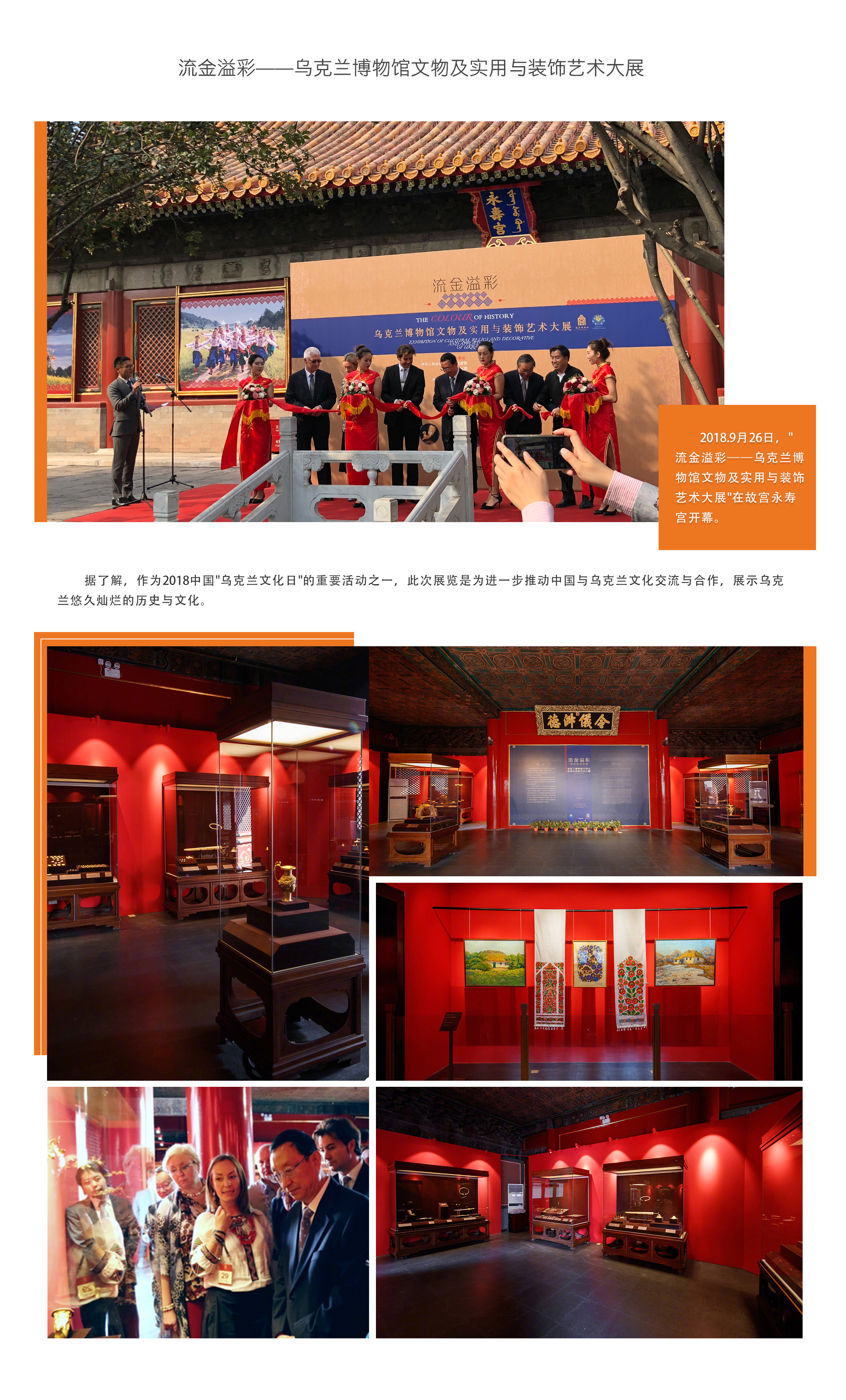 2018.9月26日,"流金溢彩——烏克蘭博物館文物及實用與裝飾藝術大展"在故宮永壽宮開幕。據了解,作為2018中國"烏克蘭文化日"的重要活動之一,此次展覽是為進一步推動中國與烏克蘭文化交流與合作,展示烏克蘭悠久燦爛的歷史與文化。